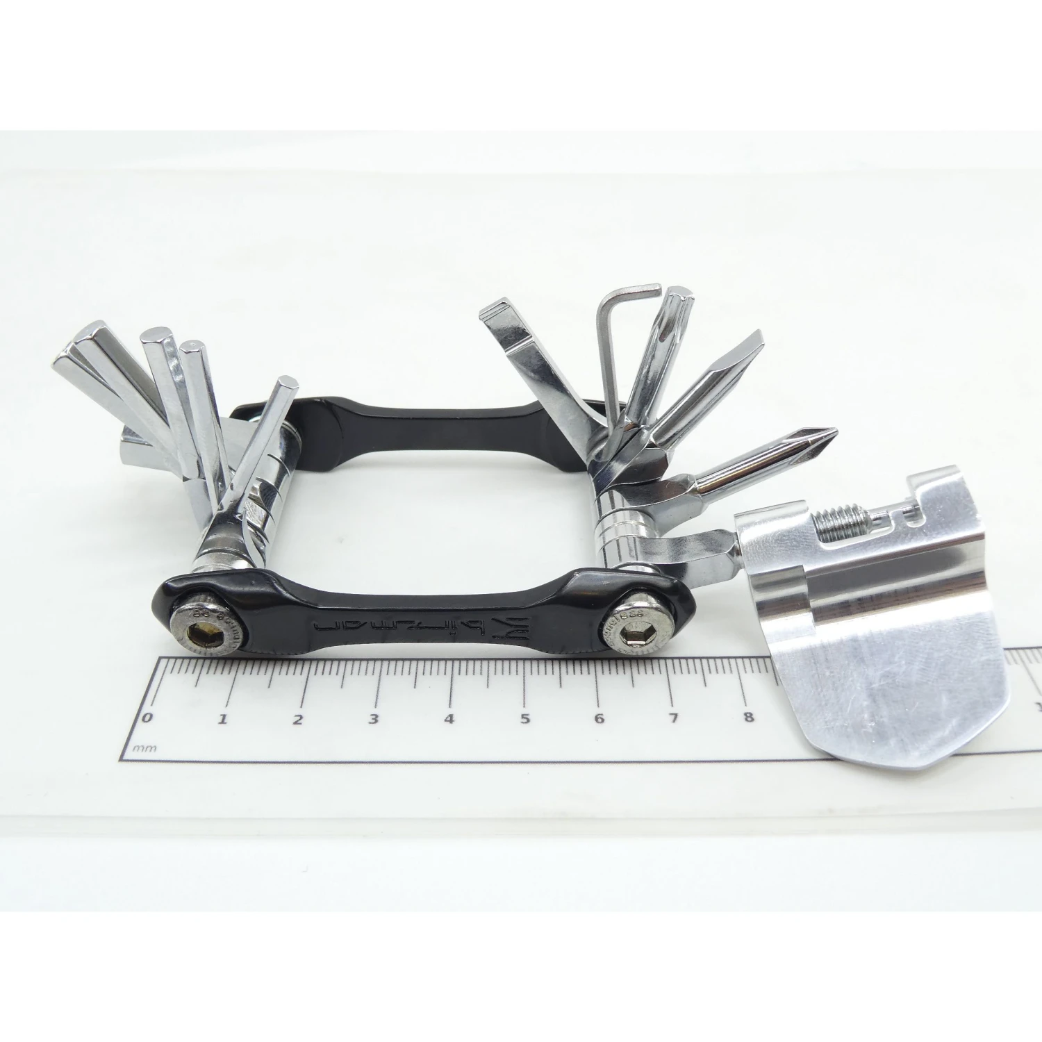 Material: Kettennieten-Schild aus Aluminium (mit Werkzeug für 12 Funktionen), Seitentafeln aus Aluminium, Einsätze aus Cr-V (6150)